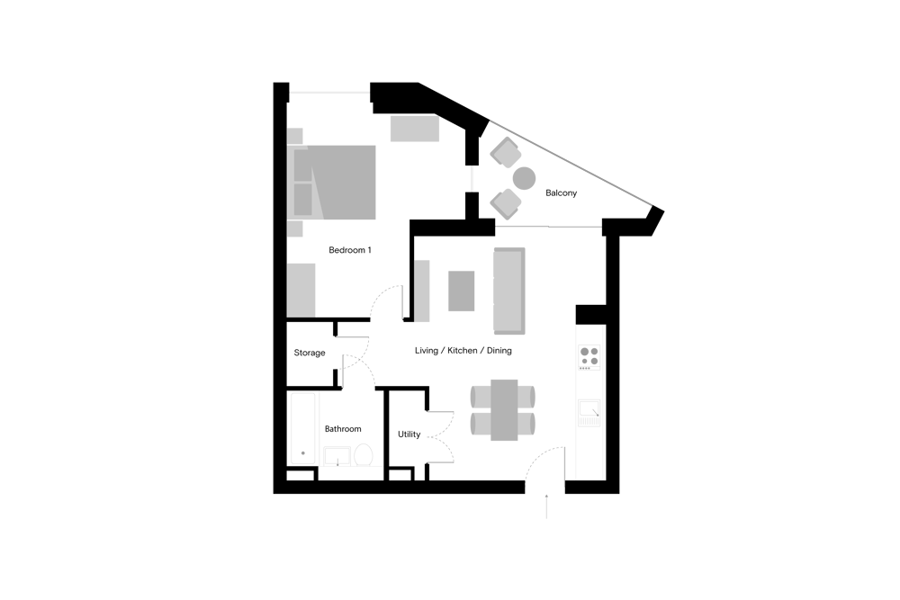 Naturally bright, floor to ceiling windows and a spacious, open-plan living area with a fully-equipped kitchen with modern appliances and private balcony.