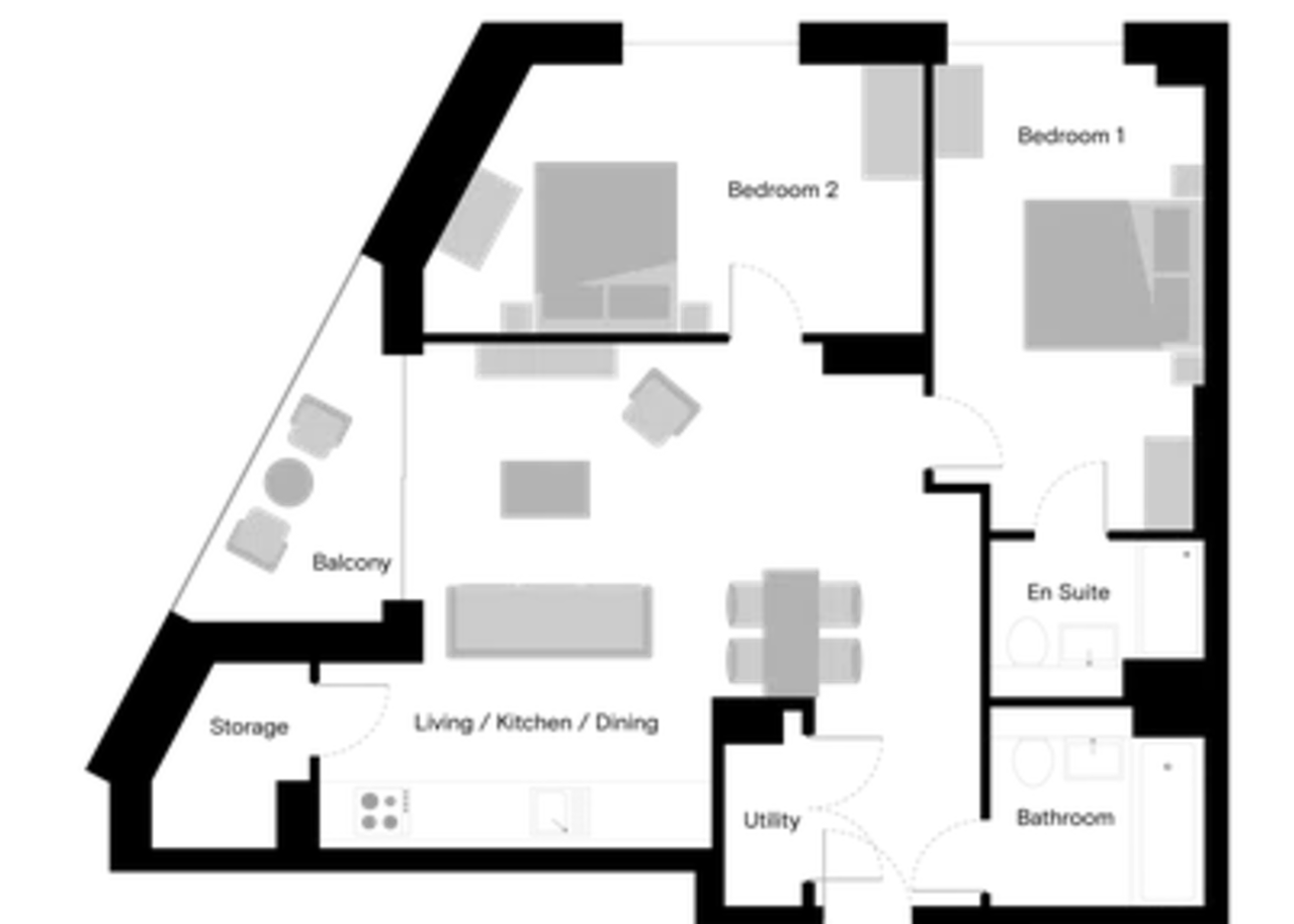 Naturally bright, floor to ceiling windows and a spacious, open-plan living area with a fully-equipped kitchen with modern appliances and private balcony.