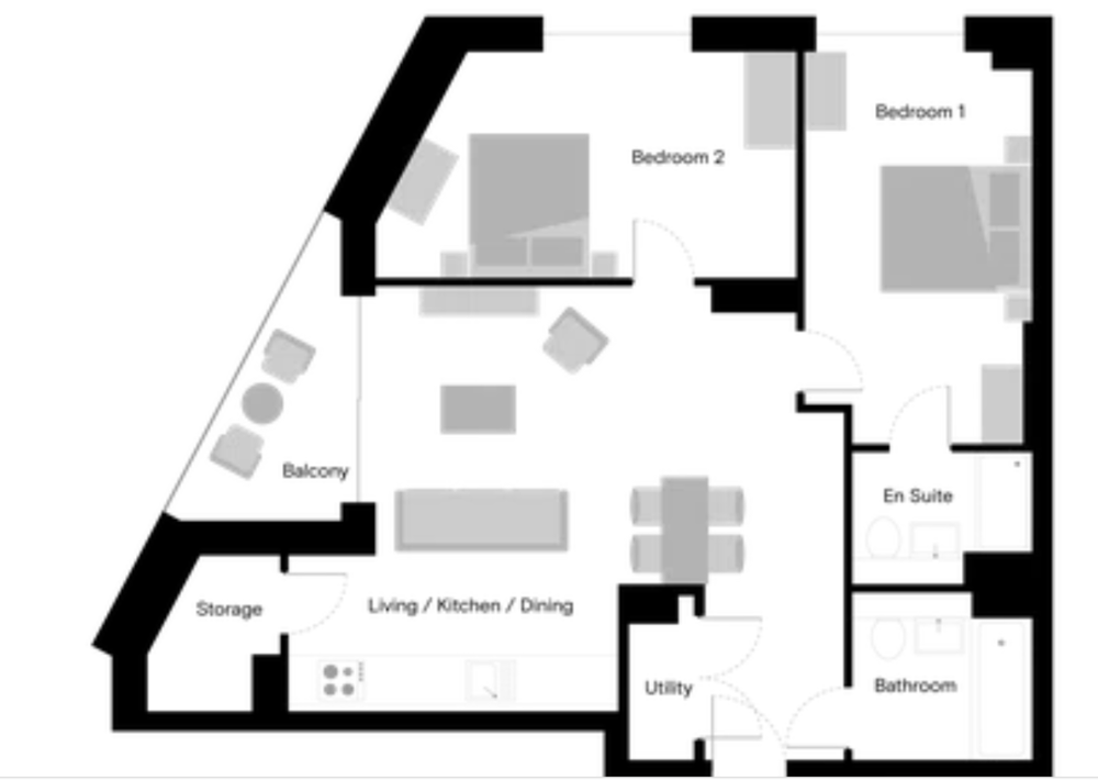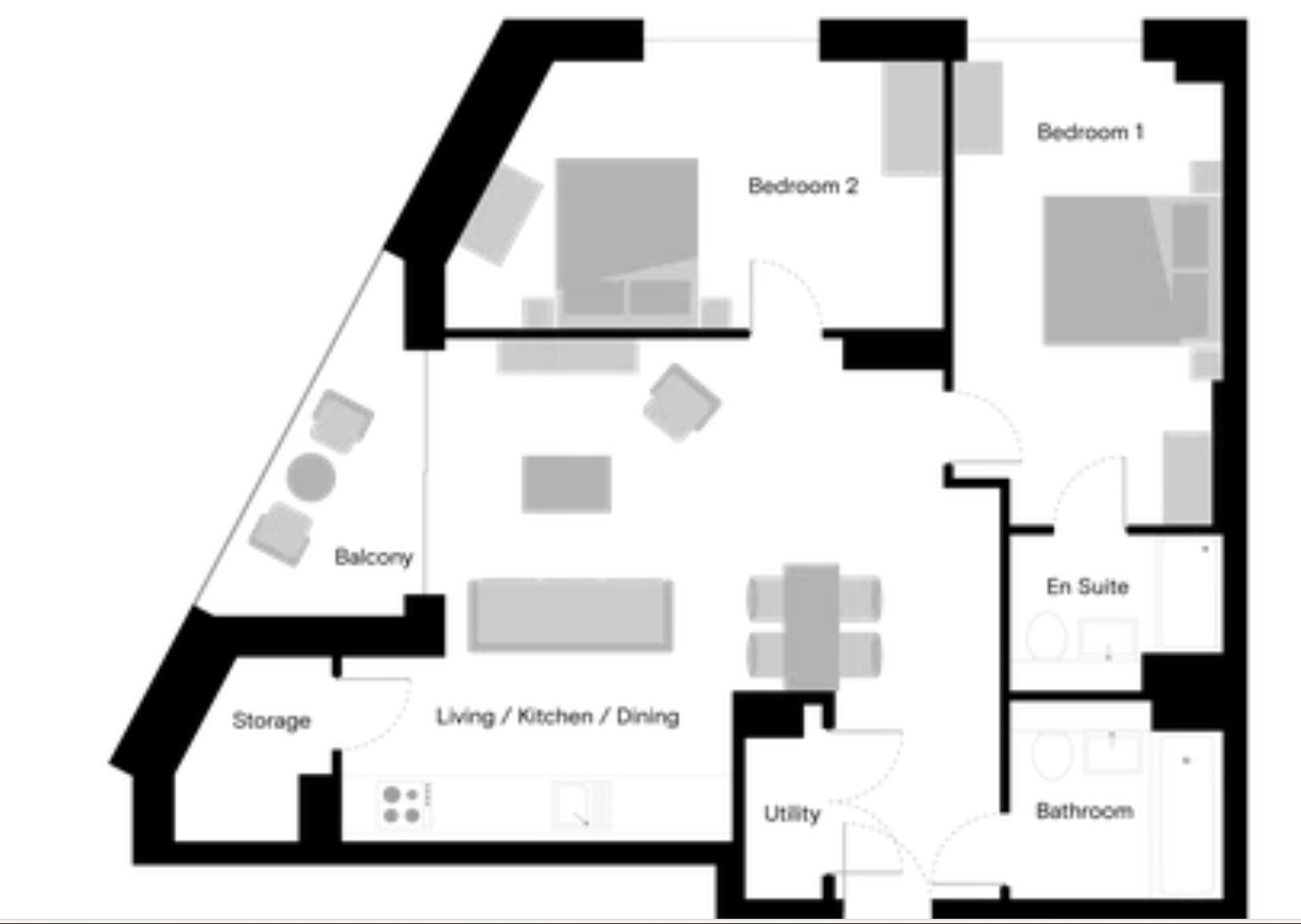 Naturally bright, floor to ceiling windows and a spacious, open-plan living area with a fully-equipped kitchen with modern appliances and private balcony.