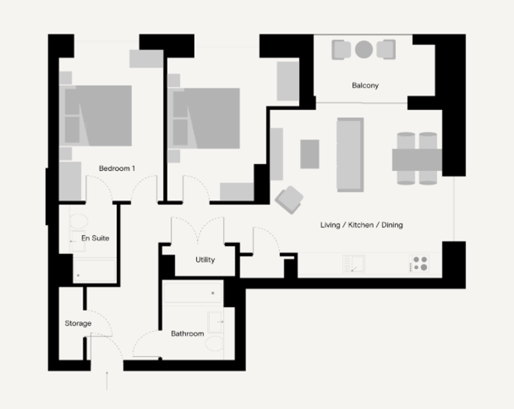 Naturally bright, floor to ceiling windows and a spacious, open-plan living area with a fully-equipped kitchen with modern appliances and private balcony.